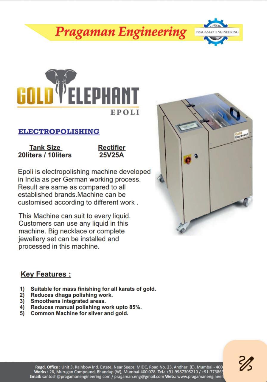 The Gold Elephant Electropolishing machine is sturdy and high-performance Electropolishing Machine manufactured in house at our facility in Mumbai. It has been developed as per German Standards, hence adheres to the same performance and quality standards.